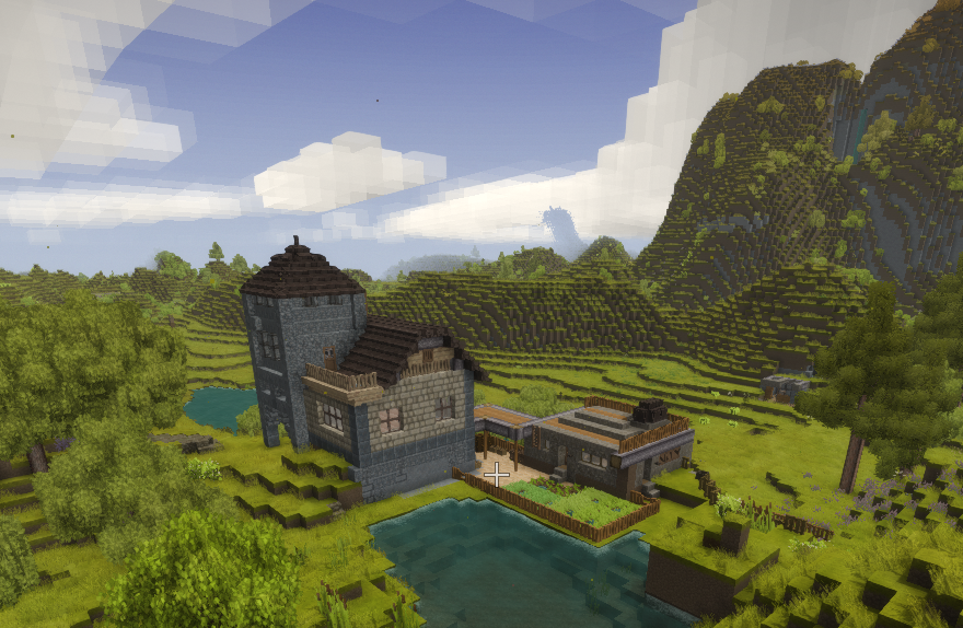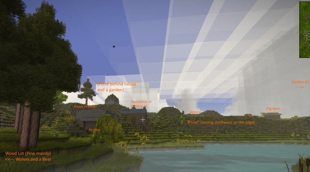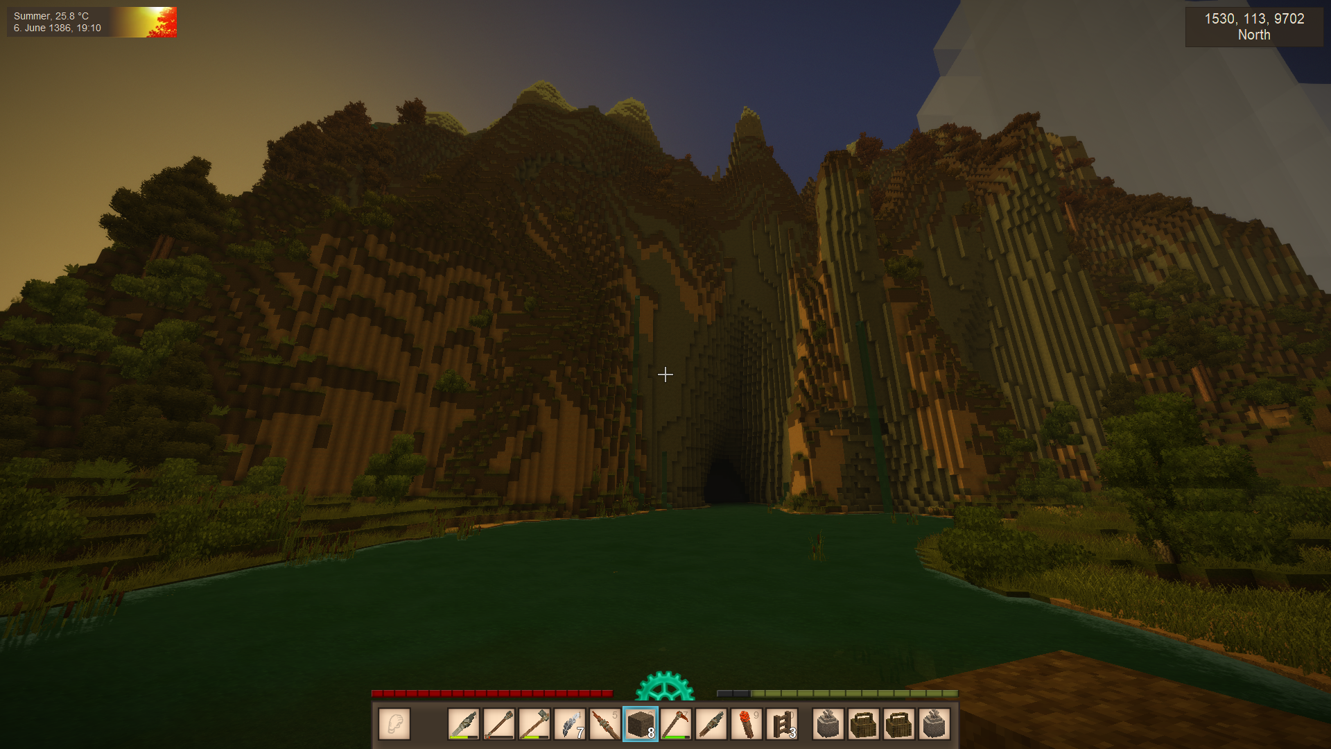 Started a new Single-player run. Moved 3-4 days south from spawn across gravel hills and forests. Have opted to settle near a nice looking mountain range (see below). Nice mix of local stone layers (andesite, slate, limestone.) House of Cubes and early farms are up. Enough tin ore turned up from a loot vessel and a single surface deposit to garner a tin-bronze anvil. Let there be saws! Lots to do still. Need to find a coal source or else start mass cutting of trees. A number of materials still to find like Lead, Bauxite, Borax, etc. Do have some leads on Iron Ore and Halite however to follow up on. Plus some cave exploration once some better armor and weapons can be produced.