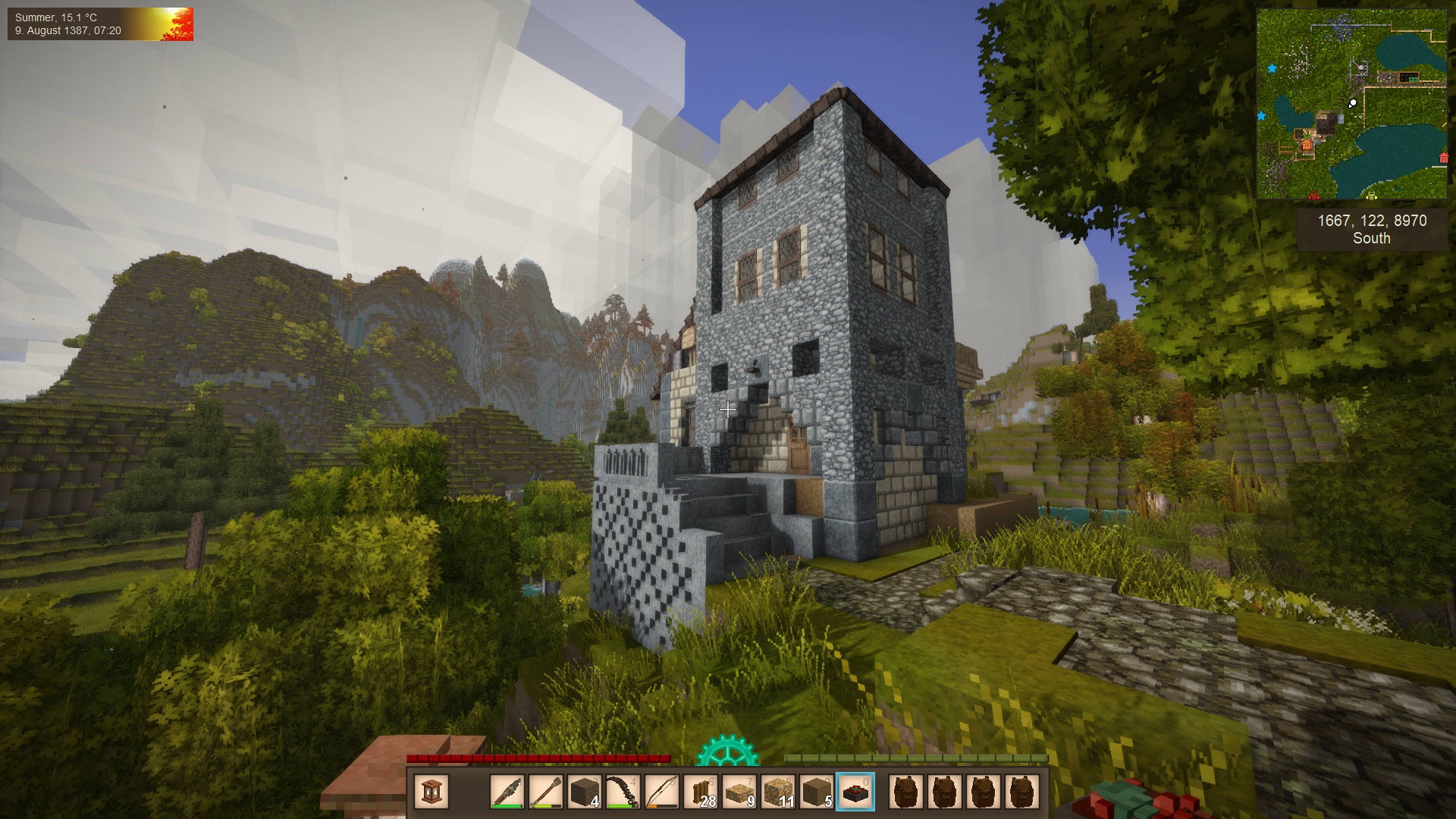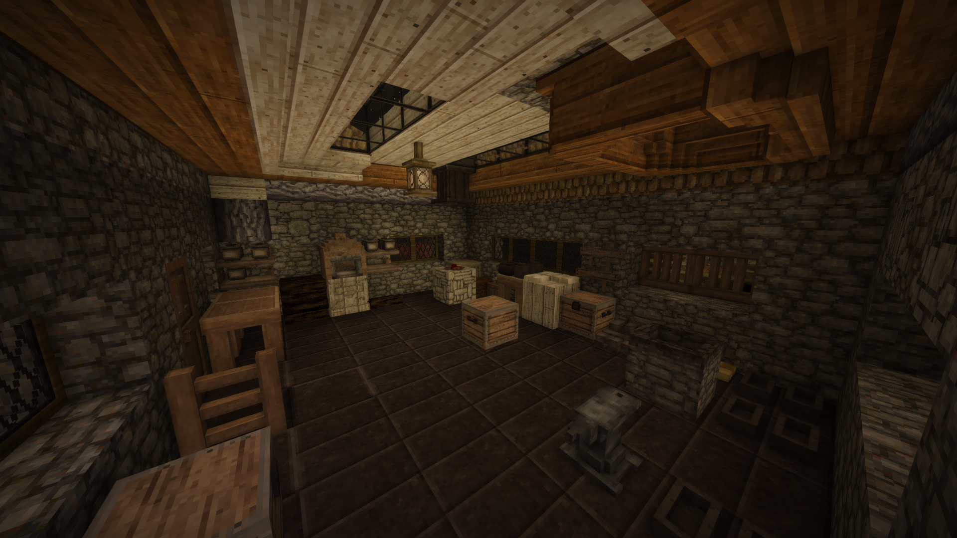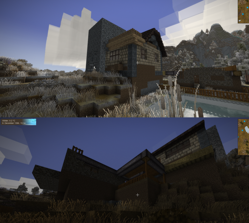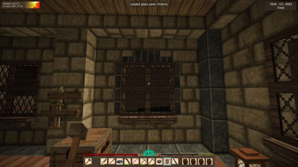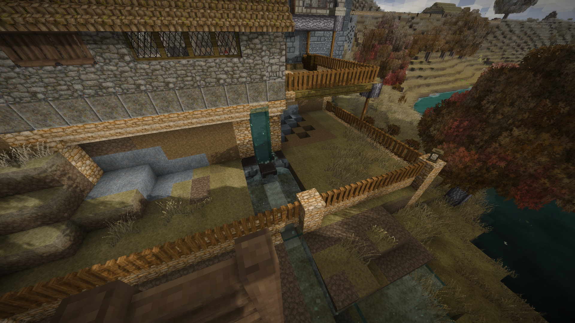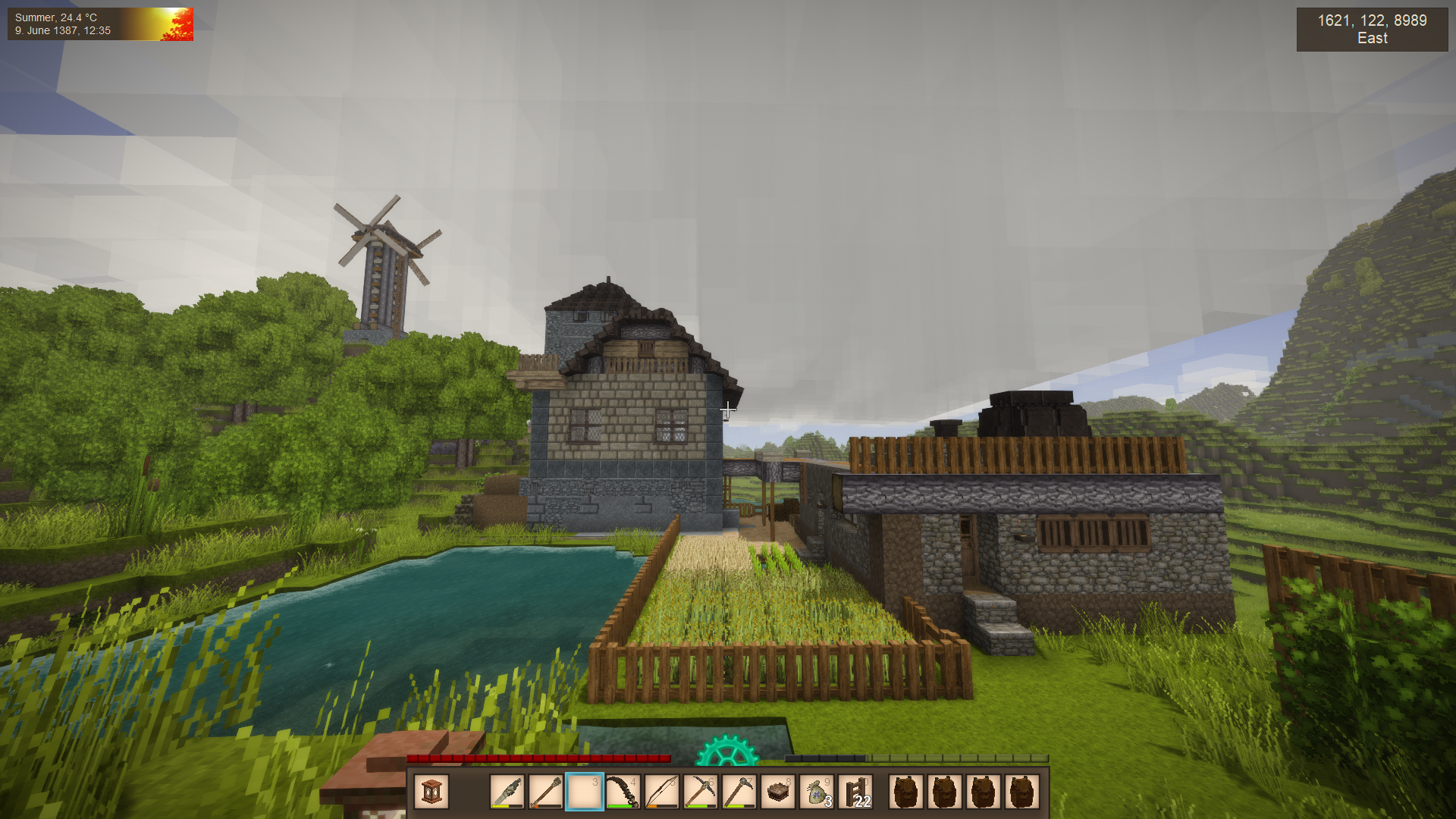 Lots of bits and pieces being worked on, and also a little bit of detail work. Mix of material gathering runs, preparing food, landscaping and paths, and the windmill. (1) East view of main house and entrance stairs from the path to the barn, apiary, and gardens. (2) Interior of windmill with the helve hammers installed/ (3) Interior of kitchen and forge after that building had it's roof raised and modified. (4) "Hatch" for water access in the kitchen. (5) New north view of kitchen/smithy with the in-progress water feature. (6) Elevated west view of the two main buildings.
