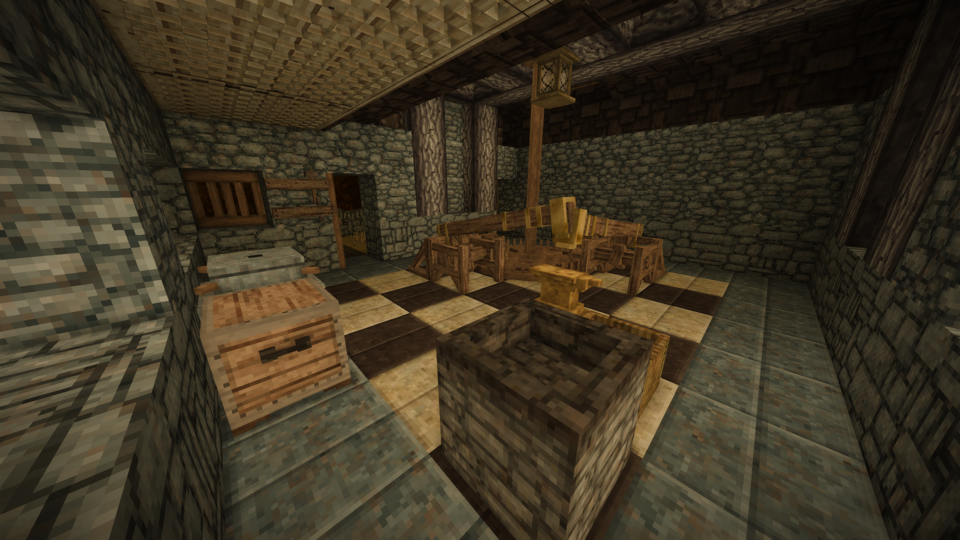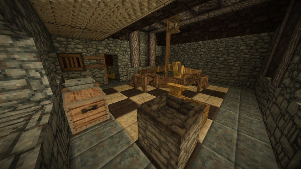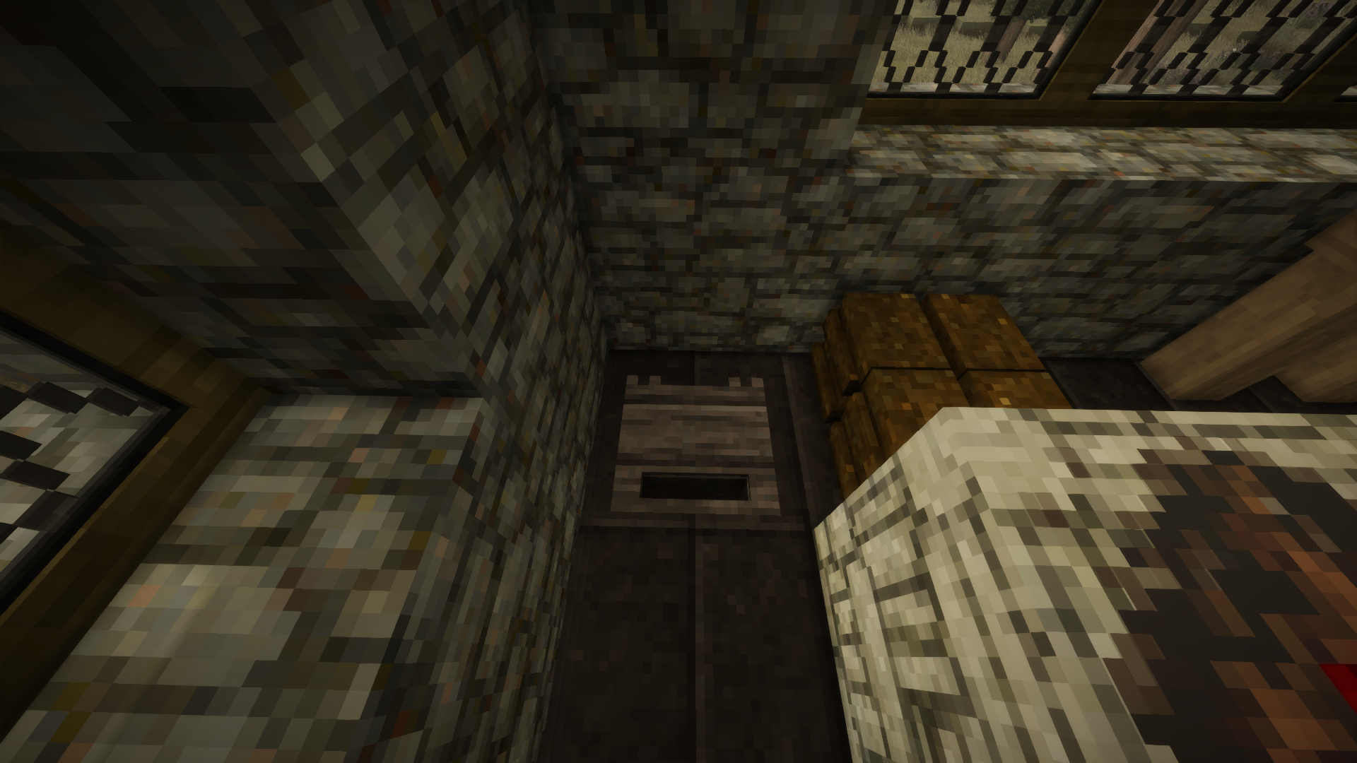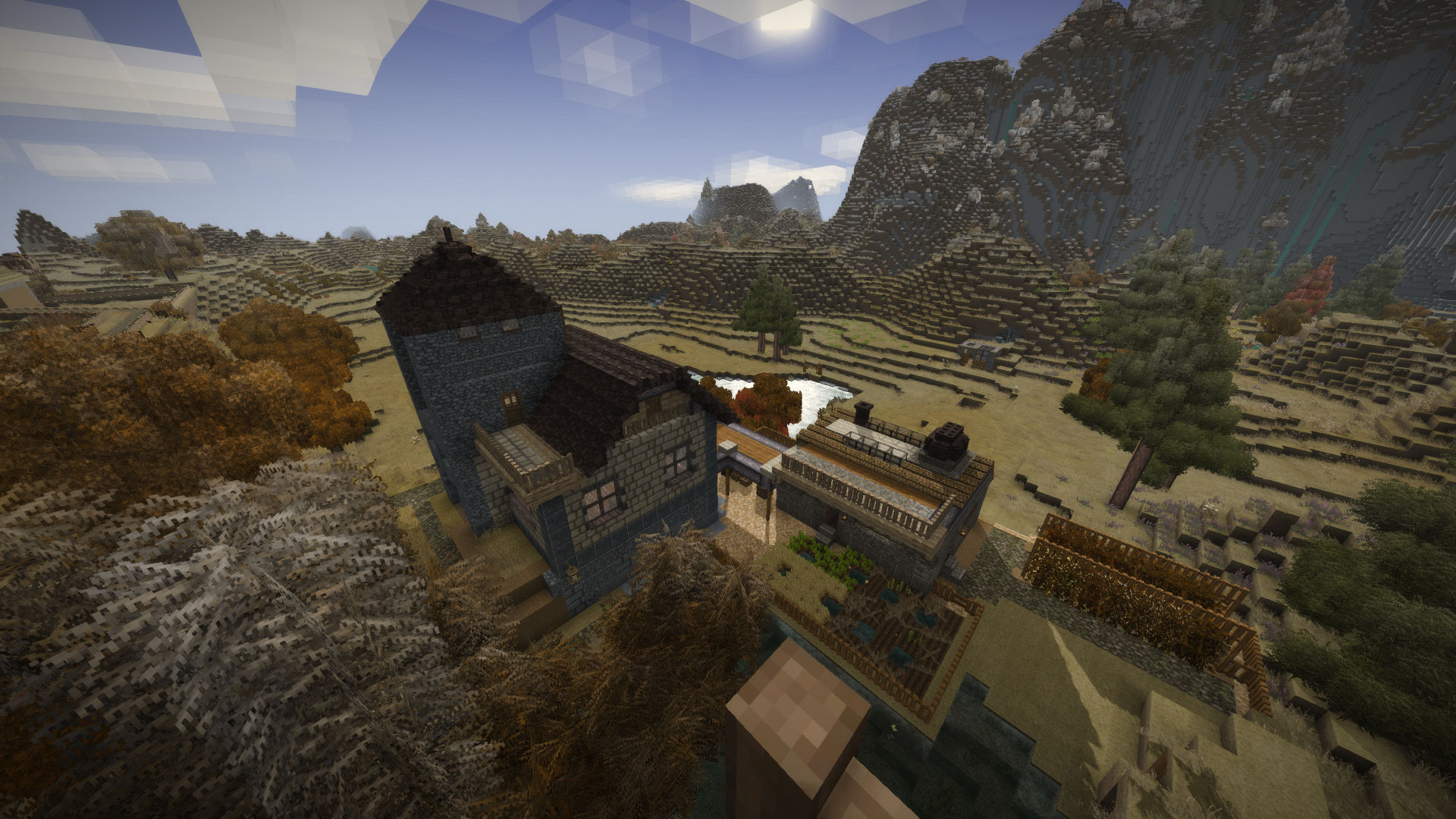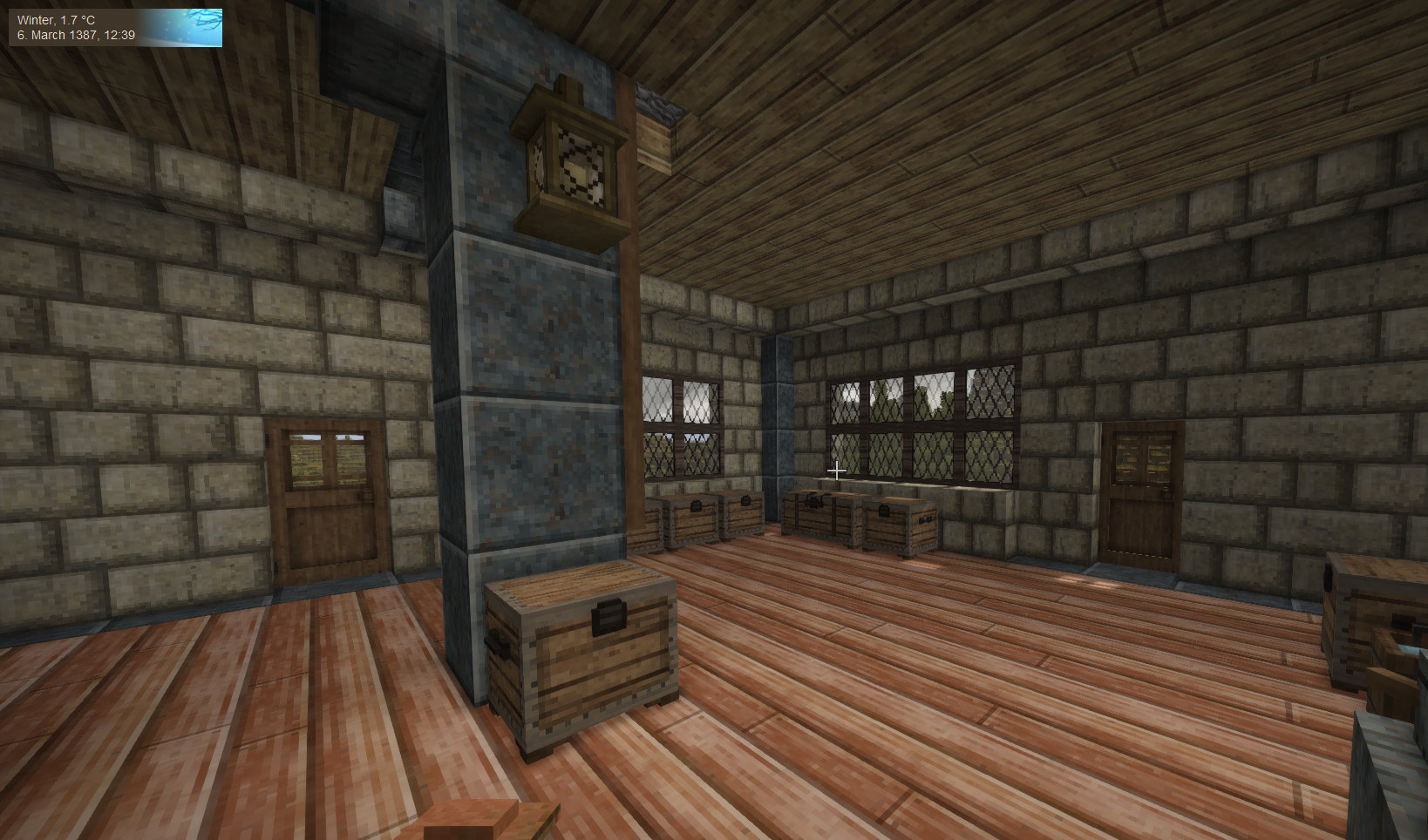 Lots of bits and pieces being worked on, and also a little bit of detail work. Mix of material gathering runs, preparing food, landscaping and paths, and the windmill. (1) East view of main house and entrance stairs from the path to the barn, apiary, and gardens. (2) Interior of windmill with the helve hammers installed/ (3) Interior of kitchen and forge after that building had it's roof raised and modified. (4) "Hatch" for water access in the kitchen. (5) New north view of kitchen/smithy with the in-progress water feature. (6) Elevated west view of the two main buildings.