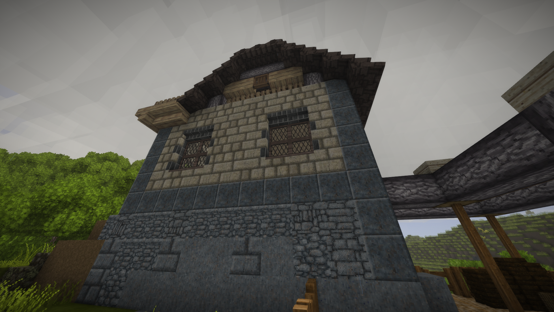Continued progress as winter sets in. Building 2 has most of a roof except for the added tower. I do like the look of mixing Andesite block or cobble with Limestone brick and the Slate Roof. Birch seems to be a good wood to do accents in due to the lighter color. Lots of material collection, fixing up, and essential organizing to do. On the tech front I have iron tools and a stock of iron ingots for the eventual iron anvil. Copper is plentiful, but lead and zinc supplies towards mass producing lanterns are low currently. Enough leather produced for a full set of backpacks and some to spare. Pigs in a barn to protect them from bears and I expect their pop to explode soon. Produced enough flax the first growing season to make a gambeson armor suit, repair clothes, and have a few stacks of twine left towards developing a windmill soon-ish. Picture below is two recent views of the main two buildings. Apologies for the poor lighting of the second one.