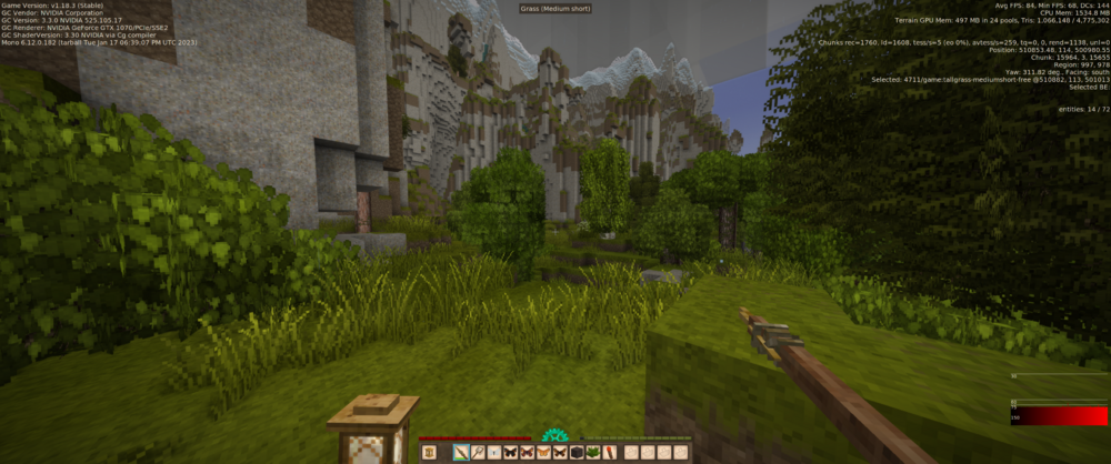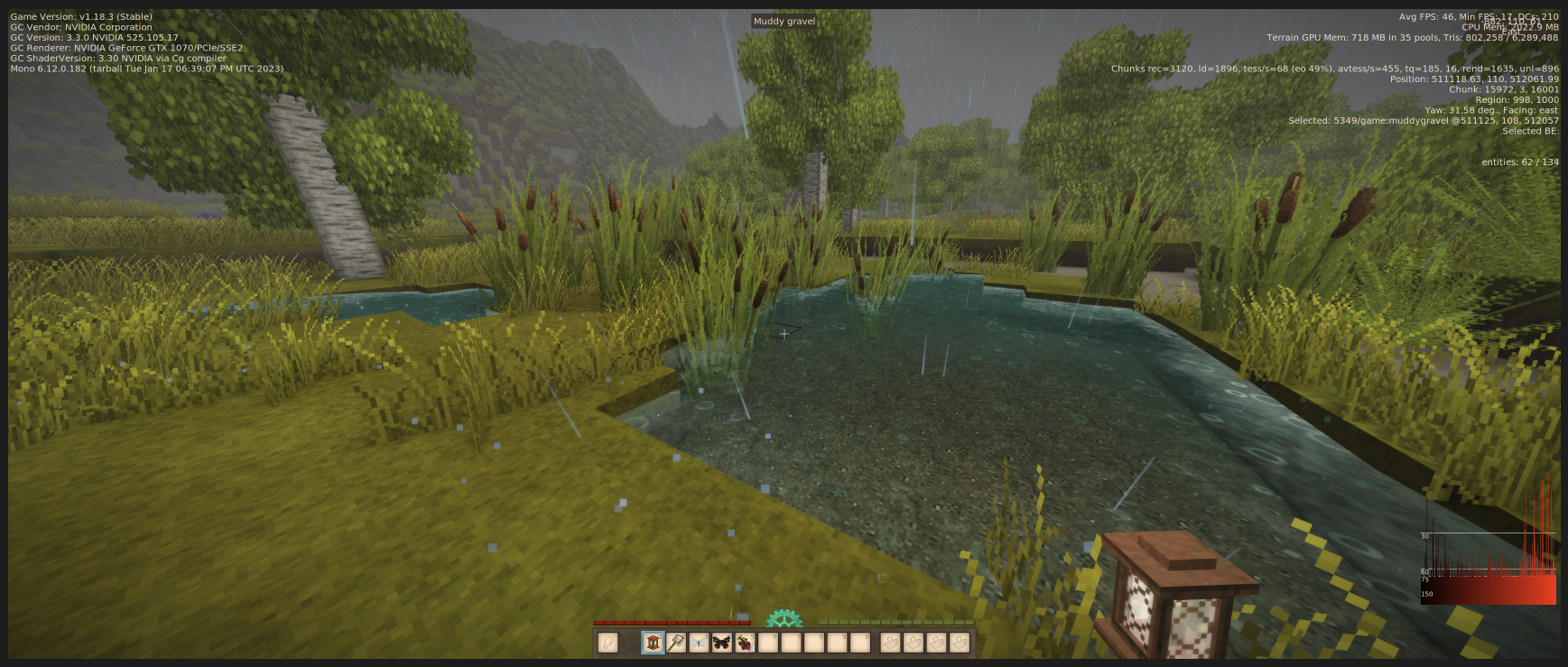 Note: This was tested on the Flatpak Vintage Story version 1.18.3, but will work on locally installed versions. Also, version 1.18.4 added the ability to enable mesa_glthread upon installation. Small Performance Boost: ▶ Enable mesa_glthread 1 of 2 ways (or both). 1) In the vintagestory script file, that launches the game within flatpak, located at: ~/.local/share/flatpak/app/at.vintagestory.VintageStory/x86_64/stable/active/files/bin/ Change the line: exec /app/bin/mono /app/extra/vintagestory/Vintagestory.exe "$@" To either: (A) export mesa_glthread=true exec /app/bin/mono /app/extra/vintagestory/Vintagestory.exe "$@" (For no other reason than to keep the "exec", so the game runs in its own process, instead of as a decendant of the script.) (B) mesa_glthread=true /app/bin/mono /app/extra/vintagestory/Vintagestory.exe "$@" (Just do it this way. You'll be able to enable the more aggressive performance boost & stutter fix if you use this.) 2) Enable mesa_glthread through a DRI-specific rule. The file is owned by root, so you're going to need to open it with this command from your terminal: sudo gnome-text-editor /usr/share/drirc.d/00-mesa-defaults.conf Go somewhere after the "<!-- The GL thread allowlist is below, workarounds are above. Keep it that way. -->" on line ~420, but above the "<!-- Adaptive sync denylist follows below: -->" on line ~666, and add: <!-- CUSTOM ADDITION --> <application name="Vintage Story" executable="Vintagestory.exe"> <option name="mesa_glthread" value="true"/> </application> ( ! ) Note: The mesa-defaults config may be in a different location. Such as: (These directories are listed in a "dri-common" file, located at: "/etc/apparmor.d/abstractions/" on Pop!_OS, at least.) /usr/lib{,32,64}/dri/ /usr/lib/@{multiarch}/dri/ /usr/lib/fglrx/dri/ /dev/dri/ /dev/dri/ /etc/drirc /usr/share/drirc.d/ ~/.drirc More Aggressive Performance Boost & Stutter Fix: ▶ Auto setting the schedule & io priority, and nice value of the game (with the System76 Scheduler). ★) You must have vintagestory script (as mentioned in "Small Performance Boost") start Vintage Story without the "exec" command. This is so the mono runtime becomes a child of the "vintagestory" script, allowing us to target it, specifically. (Use option B when following the "Small Performance Boost" instructions.) 2) You will need root permissions, so open your file explorer from a terminal with a command like this: sudo nautilus /etc/ /usr/share/ (This will open two folders.) 3) Inside the share directory, copy the system76-scheduler folder into the etc directory. (Presumably, the "system76-scheduler" folder is not present inside the etc directory, as was the case for me.) 4) Enter the system76-scheduler folder inside etc directory, and open the file: config.kdl. 5) Inside the file, find your way to the bottom of the assignments group. (Inside "process-scheduler", then inside "assignments".) 6) Copy & paste this custom vintagestory profile like so: process-scheduler enable=true { ... assignments { ... // Custom vintagestory nice=-14 sched=(fifo)40 io=(best-effort)0 { include parent="vintagestory" } } ... } (The profile also includes the surrounding context for clarity.) NOTE: "nice=-14" & "sched=(fifo)40" are maximums! (Further details provided below...) That's It! ▶ Restart your computer. And launch the game as normal!* -:-~~-:-~~-:-~~-:-~~-:-~~-:-~~-:-~~-:-~~-:-~~-:-~~-:-~~-:-~~-:-~~-:-~~-:-~~-:- Starting Sources & Notes: ☛ Stuttering was mostly fixed with these changes. Before the game was a little frustrating, but now it's comparably smoother. ▶ System76 Scheduler https://github.com/pop-os/system76-scheduler (can be installed on your linux distro) ▶ DRI GUI Application rules for mesa_glthread https://forums.bohemia.net/forums/topic/211793-mesa_glthreadtrue/ ▶ Boost Linux performance (where the rabbit hole began) Pictures: ☛ Just look at that smooth debug graph (bottom right). ☛ Before, that graph was shooting up past the 30 fps mark (so lower than 30 fps) with these sub-second spikes between "smoother" sections. ☹ Below are two screenshots from before these changes to illustrate my point. (I don't think these screenshots were the worst of it, but whatever. I hope you get my point.) ☹ Open Forest (if there is such a thing) ☹ (This screenshot has been scaled down because the file size was 3½ times bigger) ☹ Zoom into Debug Graph: ☹ Rainy Pit (there surely is such a thing) ☹ (This screenshot has been scaled down because the file size was 3½ times bigger) ☹ Zoom into Debug Graph: -:-~~-:-~~-:-~~-:-~~-:-~~-:-~~-:-~~-:-~~-:-~~-:-~~-:-~~-:-~~-:-~~-:-~~-:-~~-:- -=- Clarification -=- Custom vintagestory profile: Tweaking: Nice values go from -20 to 19, where lower values have higher priority. Sched values go from 1 to 49**, where higher values have higher priority. IO values*** go from 0 to 7, where lower values have higher priority. Do not set a higher priority than: ◊ Nice: -14 ◊ Sched: 40 ◊ IO: (realtime)4 For reference, the "Video games" section runs with the profile "games nice=-5 io=(best-effort)0". (This includes all steam games, as they are descendants of steam.) Defaults are to run processes with a set, low nice value of 6. * ... launch the game as normal * Sometimes, I've had to relaunch my game because the profile didn't kick in. It kicks in the second time, but makes my game windowed. I just enabled the fullscreen setting again and it was good as new. (By "didn't kick in", I mean I checked the nice value of the mono process with just the normal "system monitor", and it was set to 6. It was fixed when I relaunched the game.) ** 49 is maximum for the sched property ** It actually goes up to 99, but to quote, "it is recommended not to set a higher priority than hardware IRQs (>49)."[src="https://github.com/pop-os/system76-scheduler#profile"] Pipewire (the audio engine; yours could be different, such as PulseAudio) and other sound services are set with "sound-server nice=-15
