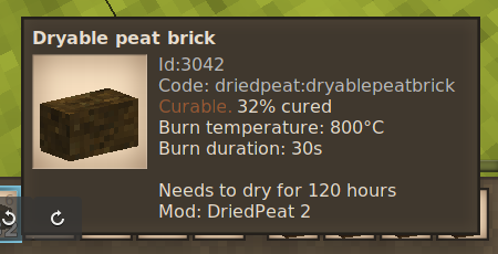 dryablepeatbrick.json { transitionablePropsByType: { "*": [{ type: "Cure", freshHours: { avg: 0 }, transitionHours: { avg: 120 }, transitionedStack: { type: "item", code: "driedpeat:driedpeat" }, transitionRatio: 1 }] }, ... code: "dryablepeatbrick", creativeinventory: { "general": ["*"], "items": ["*"] }, blockmaterial: "Soil", shape: { base: "game:item/brick" }, replaceable: 700, resistance: 2, textures: { "material": { base: "item/peat" }, "top": { base: "item/peat" } }, behaviors: [{ name: "GroundStorable", properties: { layout: 'Stacking', placeRemoveSound: 'game:sounds/block/dirt1', stackingModel: 'game:shapes/block/peatpile', tessQuantityElements: 1, stackingCapacity: 32, transferQuantity: 1, bulkTransferQuantity: 4, collisionBox: { x1: 0, y1: 0, z1: 0, x2: 1, y2: 0.25, z2: 1 }, cbScaleYByLayer: 0.125 } }], maxStackSize: 32, groundTransform: { translation: { x: 0, y: 0, z: 0 }, rotation: { x: 0, y: 0, z: 0 }, origin: { x: 0.5, y: 0, z: 0.5 }, scale: 3 } ... }