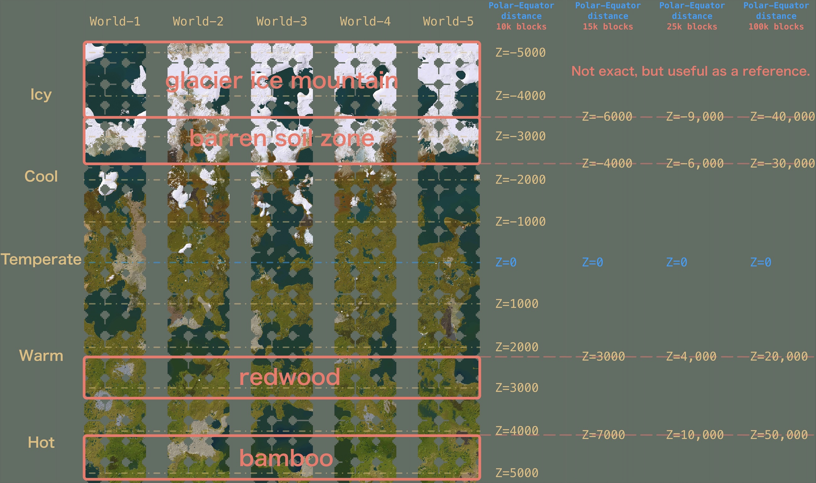 2. I recently went through my first winter in this game and decided to look for tropical crops. In my world, I lowered the Polar–Equator distance from the default 100k to 25k. Even then, I had to travel about 12,000 blocks, which felt like a pretty long trip to me. That made me wonder what value actually feels “right,” so I created several worlds and compared them. I figured other people might be wondering the same thing, so I wanted to share what I found. In all my test worlds, the only setting I changed was the Polar–Equator distance. Everything else was kept the same: Landcover: 80% Landcover scale: 100% World width: 1m blocks (default) World length: 1m blocks (default) Personally, if you’re not a fan of long-distance travel, setting the Polar–Equator distance to 10k or 15k might feel much better. Climate shifts will happen faster, but that’s the trade-off. Hope this helps!