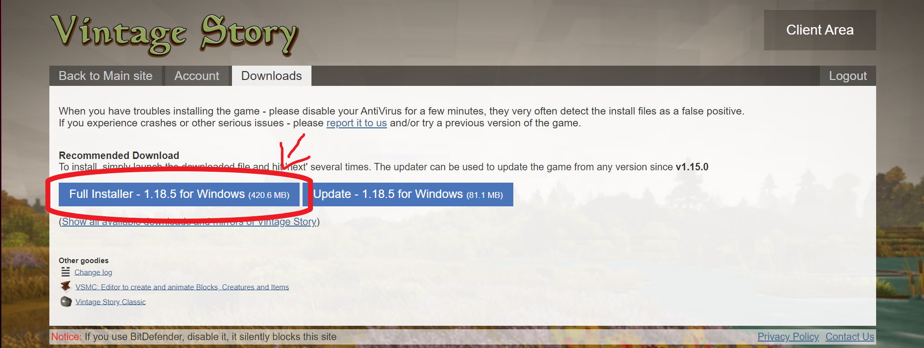 Faut que tu clique sur la section "Client Area". Cela va te rediriger vers la page de téléchargement. Après tu clique sur "Full Installer", ça va télécharger le fichier exe pour installer le jeu sur ton pc.