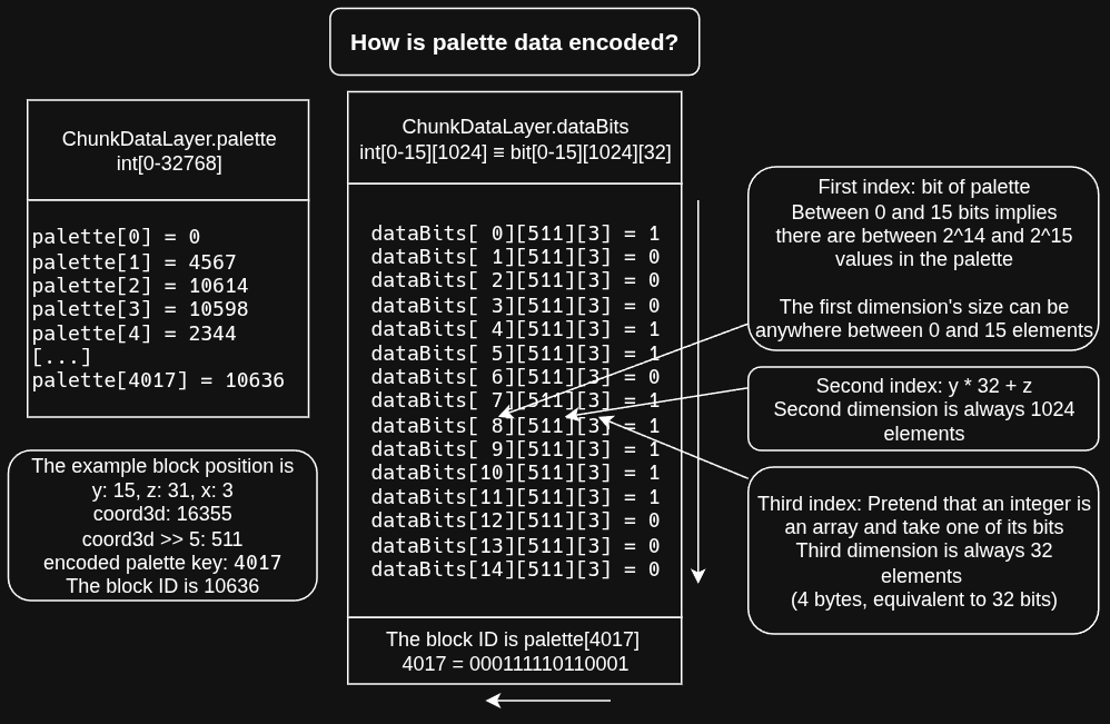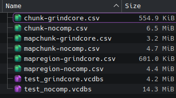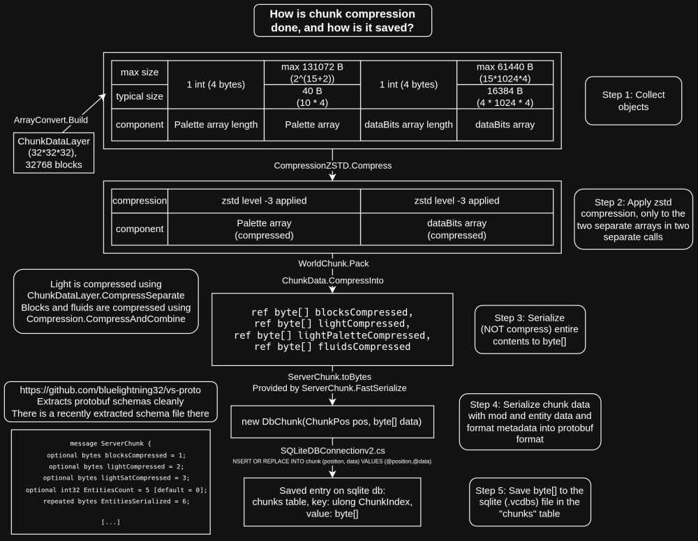 Over the past week or so, I've been determined to figure something out: why are save files so huge in vintage story? Over a similar spatial area, the map files take up hundreds of times more space compared to modded minecraft savefiles that I'm accustomed to. While they are of course not the same game, many of the underlying data storage approaches are similar, and I wanted to figure out the disrepancy. Sqlite, compression, palettes, serialization- there are many different moving parts, and judging from what I could find in the discord, I don't think many people understand how they are used in vintage story, so I thought it could be useful to write about. A good part of this is due to much of the heavy lifting being done inside of the closed-source VintagestoryLib.dll, My understanding is that decompiling it is encouraged and in some cases even required for modding, but that does have limitations of not showing comments and most variable names getting lost. My goals with this post are: - to explain what I've learned from reading the source code. - pointing out areas where improvements can be made with reducing savefile sizes and IL code - explaining why I think most of the savefile and chunk I/O be moved out of VintagestoryLib in the interest of improving performance. Diagnosing the problem I learn that .vcdbs files are sqlite databases with protobuf encoded blobs in them, so I decide to pull them up in a sqlite viewer. Protocol buffers, or protobuf for short, is a pretty simple serialization data format. Messages are serialized into a binary wire format which is compact, forward- and backward-compatible, but not self-describing (that is, there is no way to tell the names, meaning, or full datatypes of fields without an external specification). The dotnet implementation, protobuf-net, does not include any compression, but it does use something called a varint encoding by default (also possible standalone in dotnet), which reduces the space used by small values by storing in each byte, 7 bits of payload, and 1 most significant bit indicating "there's another byte to read". I found vs-proto which can be used to generate and has a recent copy of the "schema" file which describes all the protobuf objects and their data types, and they can also be figured out by looking at the source code. The contents of the sqlite tables is explained at a high level on the wiki, and I can quickly make a table of my survival world with a total size of 245M: As indicated by the wiki and reading the source code, the chunk table is the only one that stores 3d data of blocks in the world. mapchunk and mapregion store 2d data, so why is mapchunk bigger? I put a breakpoint in Vintagestorylib's ServerMapChunk.FastSerialize which catches the data just as it is getting sent to protobuf for being stored in sqlite. These all the arrays stored in mapchunk protobuf blob: RainHeightMap: ushort[1024] TopRockIdMapOld: int[1024] WorldGenTerrainHeightMap: ushort[1024] NewBlockEntities: Pretty small CaveHeightDistort: byte[1024] SedimentaryThicknessMap: ushort[1024] TopRockIdMap: int[1024] This alone is 2048*3 + 4096*2 + 1024 = 15360 B per chunk column, and it doesn't get compressed other than from protobuf varints. It turns out that the chunk table is usually smaller than this, which is the simple answer why mapchunk is bigger. It's pretty remarkable to me how I can get a half decent 2d layout of ore maps just by ripping a save's mapregion sqlite blobs, mapping to utf-8 and stretching a text box. Palette basics In minecraft the term used for optimising chunk storage is local palettes. A similar idea is indexed colors in images, where the png format allows for encoding directly in an indexed format as opposed to a big RGB/A array. This is the same general principle behind the LZ77 family of compression algorithms in combination with huffman encodings (gzip/DEFLATE). There are a few advantage of doing this at the program level instead of relying on an external compression algorithm for indexing the chunk data: different spatial cutoffs can by dynamically chosen to minimise size. For example, there are cases where 32x(32x1x32) spatial indexing with 32 index tables will outperform 1x(32x32x32) indexing with one index table, and vice versa. This is because the varint encoding saves space, and a concatenated huffman encoding can save more space. Depending on the size of the index, it's also possible to save space by electing to use less than a 7-bit varint payload. It can be difficult to make efficient algorithms to recalculate spatial cutoffs, palettes, and huffman codes however. The chunk data is fundamentally spatial, which means it can be described using linear interpolation, 2d or 3d raster vectorization, and spatial clustering algorithms. A combination of these is likely to far surpass compression ratios compred to an approach that only uses palettes. Vintage story uses both palettes and compression for chunk data, but as I'll explain, I think there are pretty large flaws in the implementations of both. Assuming a world height of 256 which is configurable, data is partitioned into vertical chunks in the WorldChunk class (32x256x32), and further partitioned into ChunkData, containing multiple ChunkDataLayers which contain 32x32x32 spatial regions. There's a layer for blocks, fluids and light - the fluid one is often empty, but all three store their information using the same palette system. The liquid and block layers are actually BlockChunkDataLayers, but they do essentially the same thing as ChunkDataLayer. The light layer is actually fully populated for all ChunkData instances. This is my first observation: Considering how easy it is to compute, it's incredibly wasteful, I would think, to give a full integer's worth of light level to every single block, especially those completely surrounded by blocks, and to store that in the savefile. In a ChunkDataLayer with some trees or cave entrances, they can even take up more space 